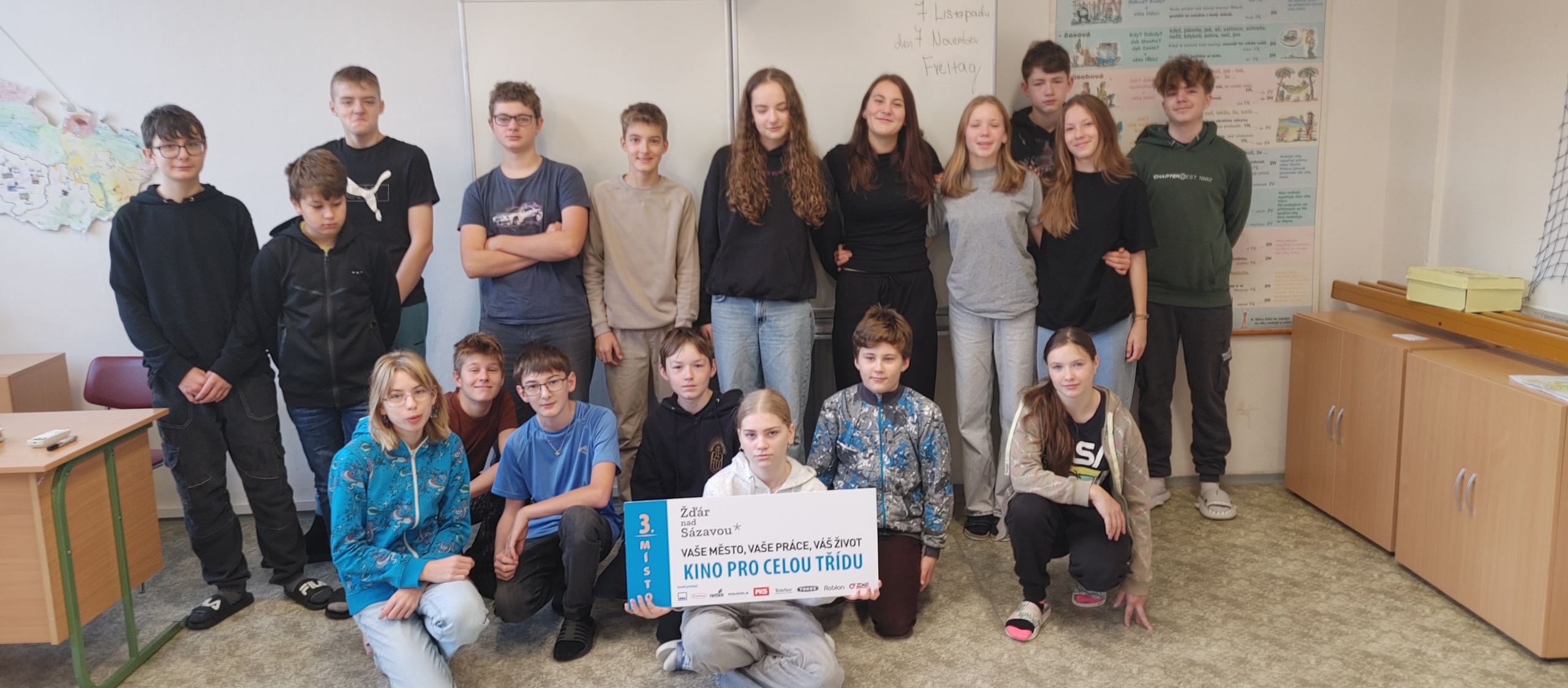 V letošním roce byla vyhlášena také soutěž Vyhraj kino pro celou třídu. Cílem soutěže bylo vytvořit zajímavý projekt o žďárských firmách. Žákyně 8. ročníku DORA BLAHOVÁ napsala krátké výstižné básničky na všech 9 firem, které soutěž sponzorovaly. Básničky doplnila obrázky. Porotě se její práce velmi líbila a Dorka získala v soutěži 3. místo a pro celou 8. třídu lístky na filmové představení.